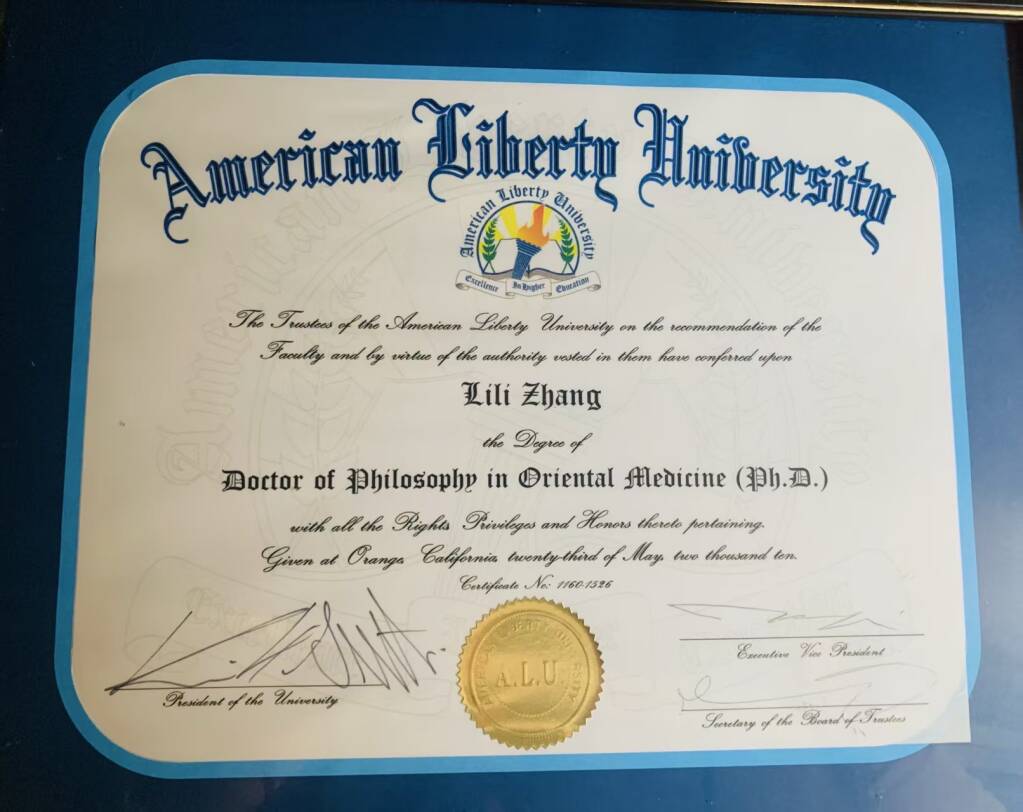 张丽莉美国中医博士证书